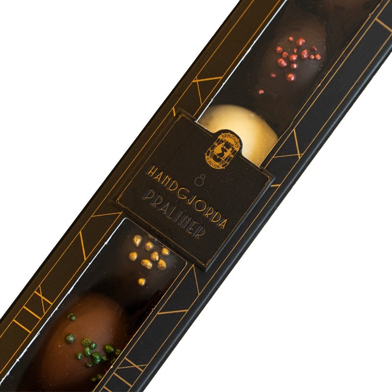 8 st handgjorda chokladpraliner i lyxig chokladask.
