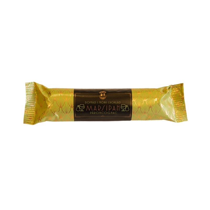 Marsipanbröd gjord på spansk mandel av högsta kvalitet med smak av päroncognac, doppat i 70% mörk choklad.